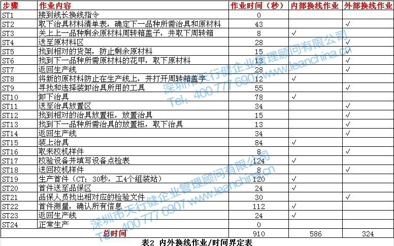 根據(jù)現(xiàn)場(chǎng)觀察,表1中的所有24步驟均是裝配線停止后進(jìn)行的,即現(xiàn)狀中所使用的910秒都為內(nèi)部作業(yè)時(shí)間,故對(duì)表1的記錄對(duì)現(xiàn)有換線過(guò)程進(jìn)行區(qū)分,進(jìn)行內(nèi)部作業(yè)外部化,明確界定內(nèi)外換線作業(yè),同時(shí)統(tǒng)計(jì)內(nèi)外換線時(shí)間
