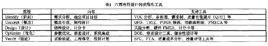 六西格瑪設(shè)計(jì)的ICDOV流程中的詳細(xì)內(nèi)容和支持工具如表1所示。表1中對ICDOV流程進(jìn)行了歸納總結(jié)。